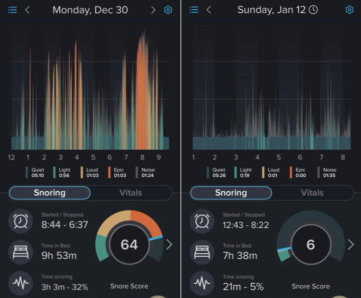 In the video on the left, you can see how our innovative design activates and strengthens the throat muscles responsible for snoring. And the data on the right — recorded independently using the SnoreLab app* — shows what that progress looks like in just 13 days.
